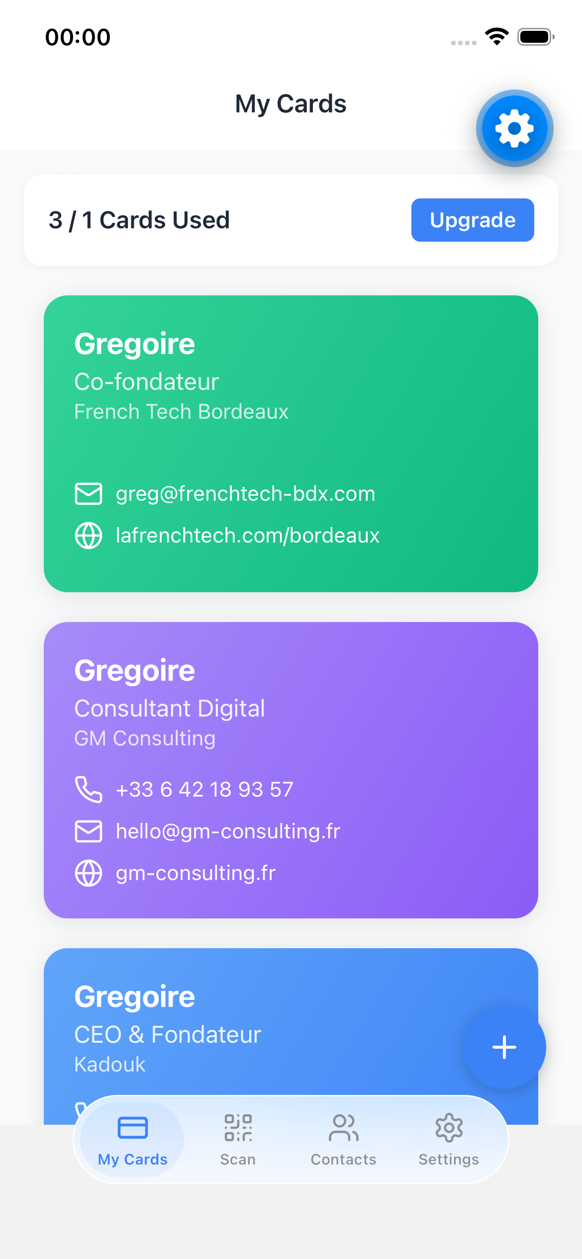 Vous représentez 3 marques ? Vous avez un side business ? Créez une carte par activité avec son propre logo, ses propres couleurs et ses propres coordonnées. Passez de l'une à l'autre en un tap avant chaque rendez-vous.